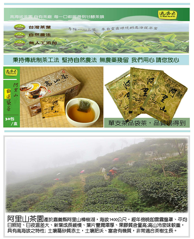 產地介紹:阿里山茶園產於嘉義縣阿里山樟樹湖,海拔1400公尺,經年傍晚即雲霧壟罩、平均日照短、日夜溫差大、新葉成長緩慢、葉片豐潤渾厚、果膠質含量高 ; 高山冷泉味較重,具有高海拔之特性;土壤屬砂質赤土,土壤肥沃、富含有機質,非常適合茶樹生長。