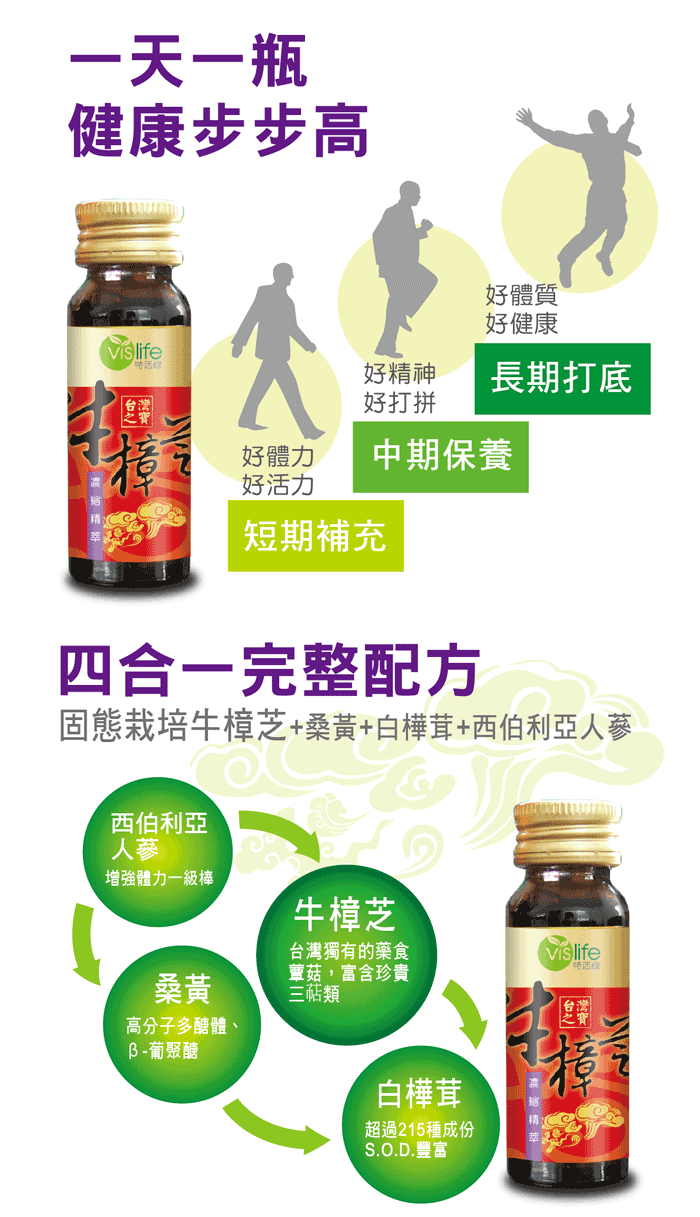 ♦產品成分:固態栽培牛樟芝子實體及菌絲體混合萃取物、桑黃子實體、白樺茸子實體、西伯利亞人蔘萃取物、枸杞萃取物、甘草萃取物、純水