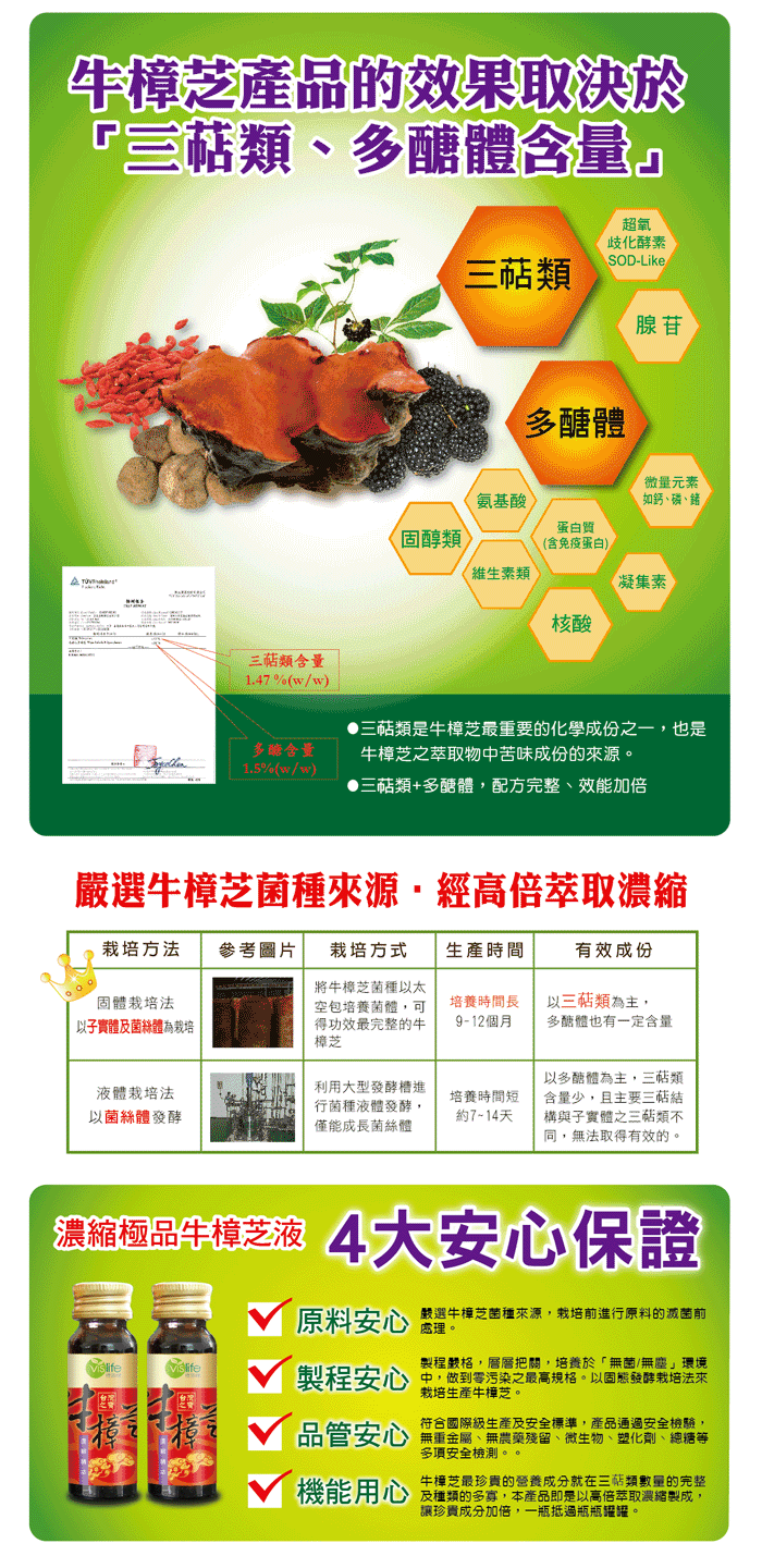 ♦添加優質白樺茸、桑黃菇體原料,多醣有效成份濃度高