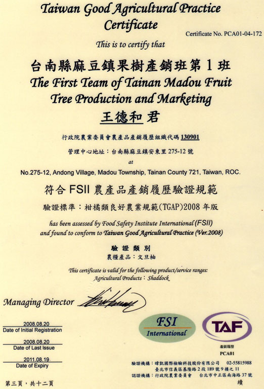 • 行政院農委會農產品產銷履歷組織代碼:130901